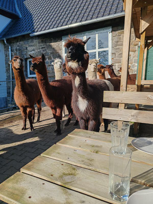 Nach der Tour sitzen wir bei den Alpakas und stärken uns mit Maibowle in 2 unterschiedlichen Varianten und Snacks.