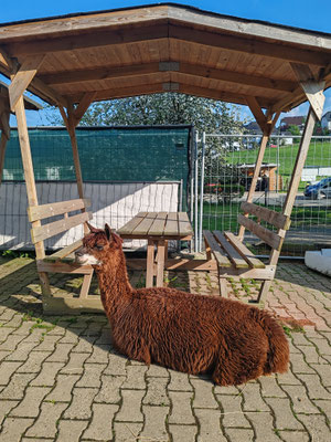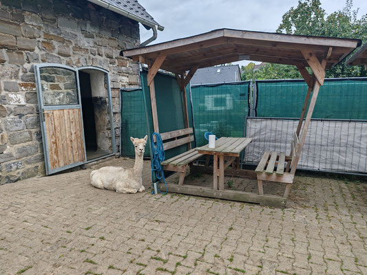 Vor oder nach der Tour sitzen wir bei den Alpakas und erfrischen uns mit einem Eis und Kaltgetränk.